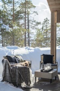 I vår styling under ser du at vi har valgt et rundt teppe hvor stolene er innenfor. Når du sitter i stolene derimot vil ikke hele stolen være innenfor, derfor er dette et teppe som er litt for lite. Vi kan ikke alltid style med de mest optimale teppene siden det er flere ting som spiller inn. Til kunder ville vi dog anbefalt teppe-størrelsen over. Teppet du ser i stylingen er fra Bohus og heter Karma.